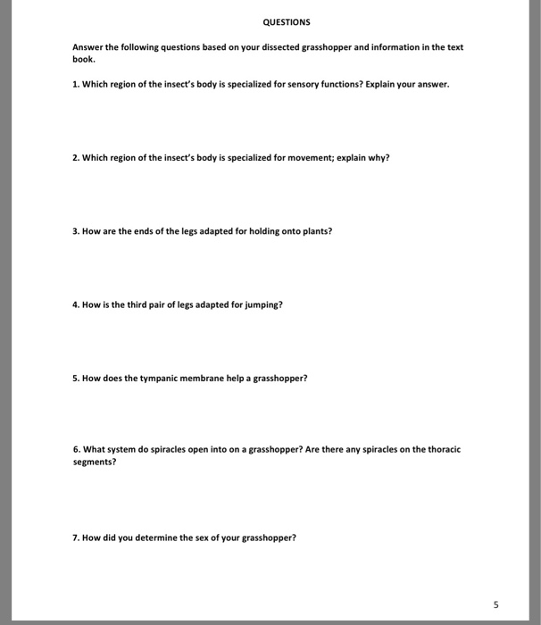 Grasshopper Lab Questions Docx 1 Which Region Of The Insect U2019s Body Is Body Is Specialized For Sensory Functions A The Head Is Specialized For Course Hero